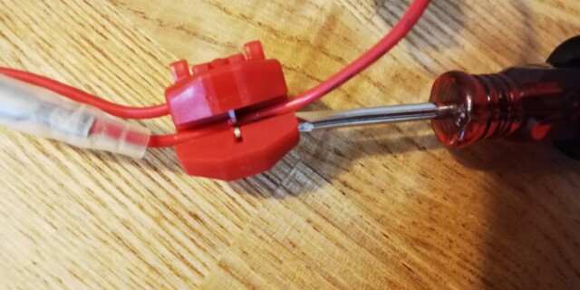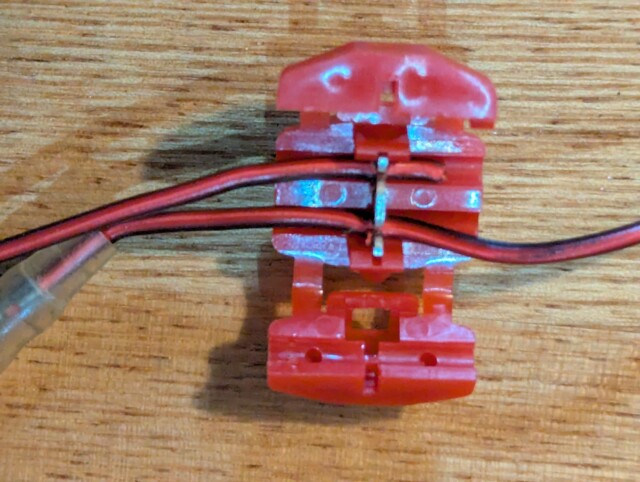 配線コネクターは、被覆を剥かずに「挟んで圧着するだけ」で電源分岐ができるのが特徴です。